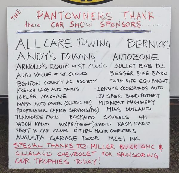 On behalf of the St. Cloud Antique Auto Club (The Pantowners), I would like to thank everyone that helped make our 2022 Car Show and Swap Meet a success. This goes out to those that either entered their vehicle into any of our 39 trophy classes or into the Used Car Corral. Also thanks to all of the Swap Vendors, Indoor Crafters, Food Vendors, Model Car and Valve Cover Racer entrants, our Sponsors (see this list below), Volunteer Groups, fellow Pantowners working our show, and the list goes on.